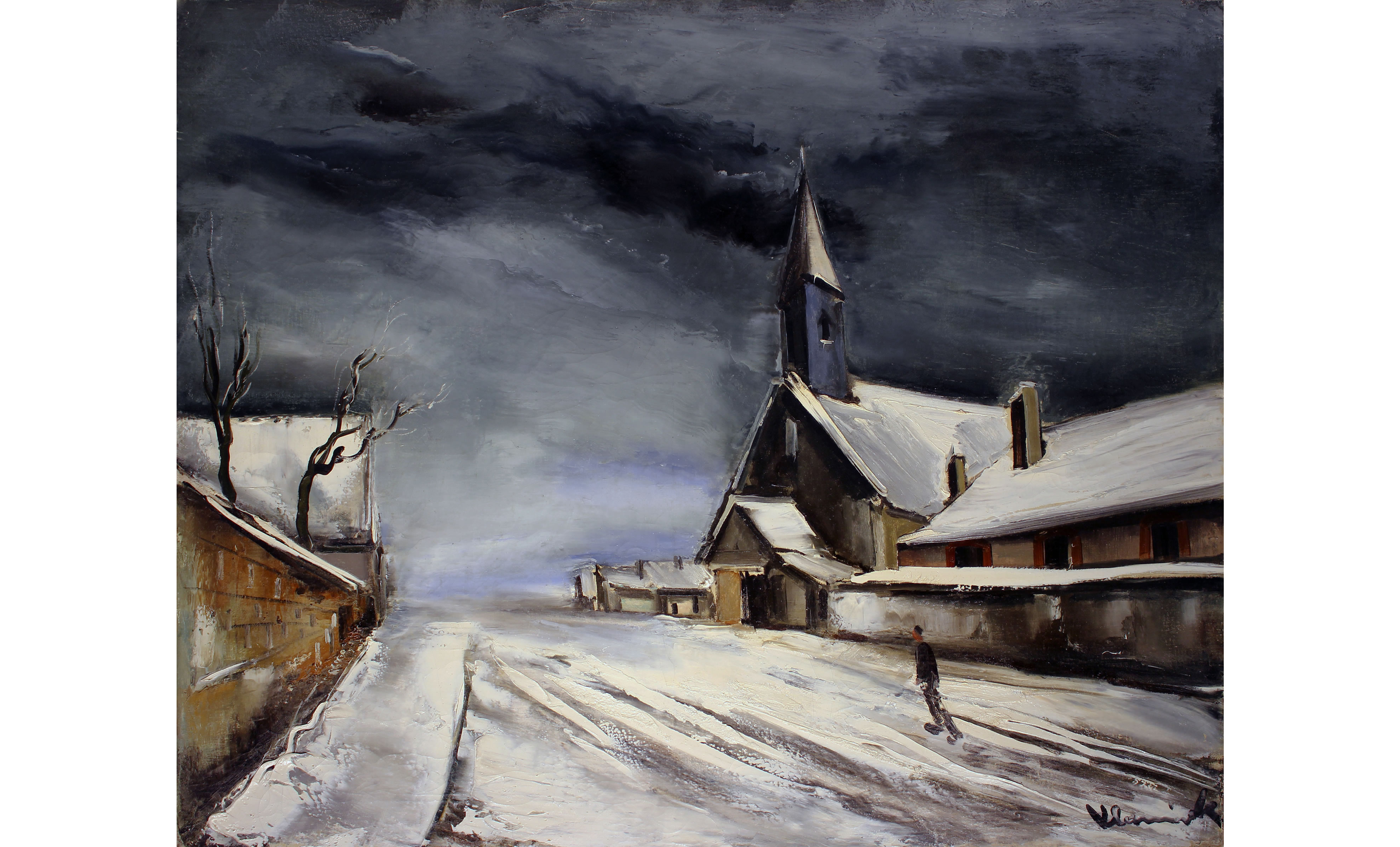 目の前にあるブラマンクの絵に描かれた景色は、実在の風景ではないのではないか。雪で白く覆われた道や、不穏な空、歩く男、風雪のなかに聳り立つ教会さえも。否、実在していようと、していまいとそれはどうでもいい事なのだ。何故ならこの絵にブラマンクが描いたのは、あるいは描きたかったのは、「生きて行くとは」という問いかけ、あるいは「生きて行こう」とする勇気なのかもしれないから。「それでも」という逆説の接続詞をともなった。